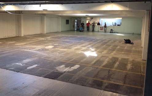 Teppet på 480 m2 er som sagt på lager. Før teppe legges ut skal gulvet gjøres speilrett. Kjørepodiet er tatt bort, det gamle teppet er fjernet og gulvet ble støvsuget i går. I dag - 27 juni - skal vi preppe gulvet før 4 tonn flysparkel skal på. Da bør helst gulvet være tett, slik at ikke naboen under får sparkel i håret... :-)